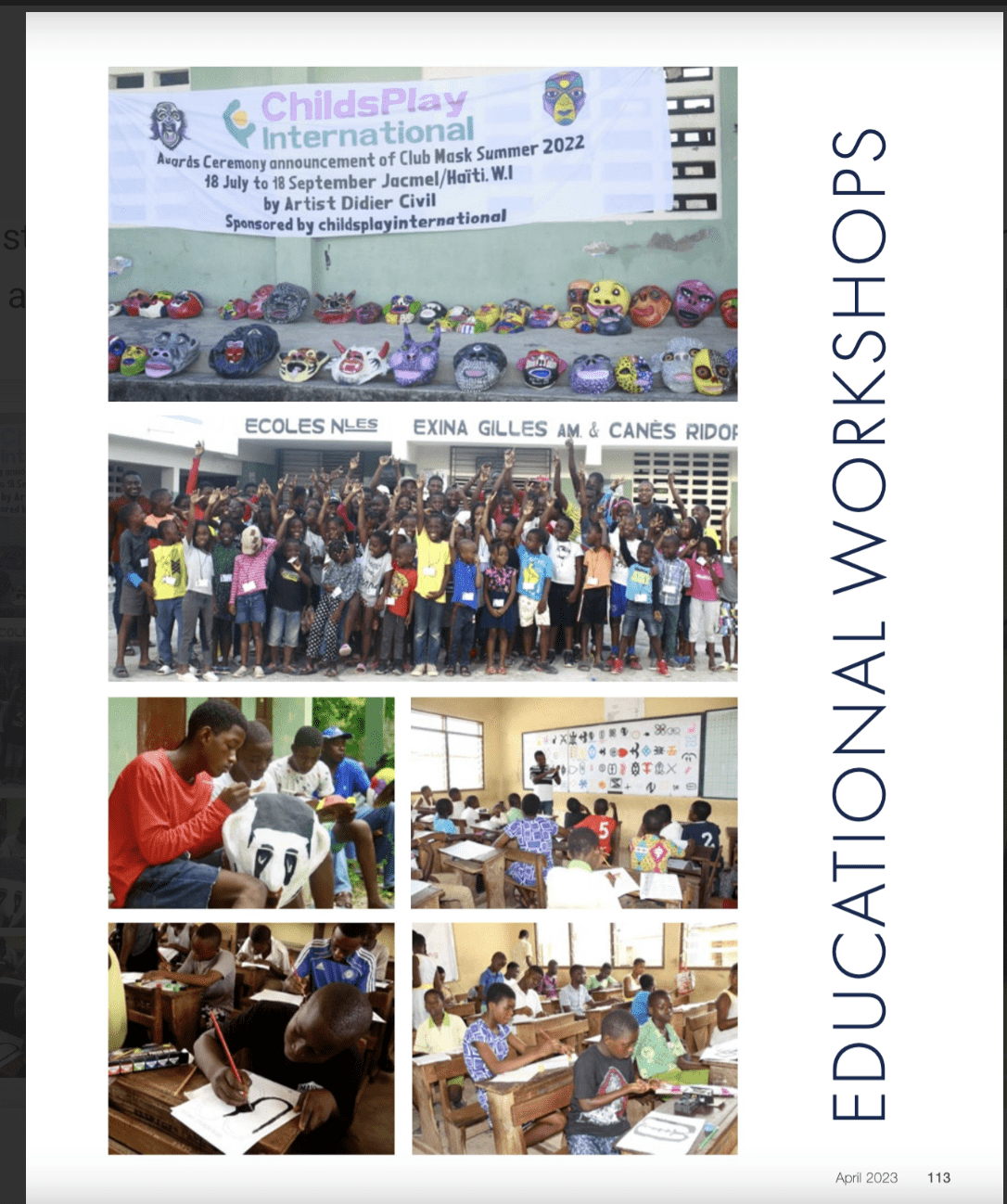 We thank 25A Magazine, Lonee Telemaque for the top-shelf art direction, and Adam Kluger PR for recognizing the importance of featuring nonprofits such as ours alongside beautiful images of movers and shakers on New York’s Gold Cost and Palm Beach/Miami. Vulnerable children in many countries benefit so much from donors in these markets. All our proceeds go to organize and facilities workshops on mask-making, puppetry and storytelling.